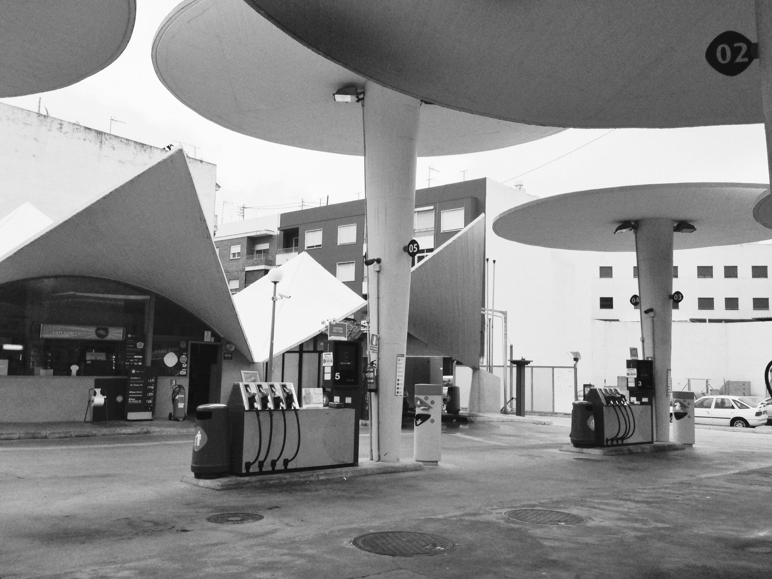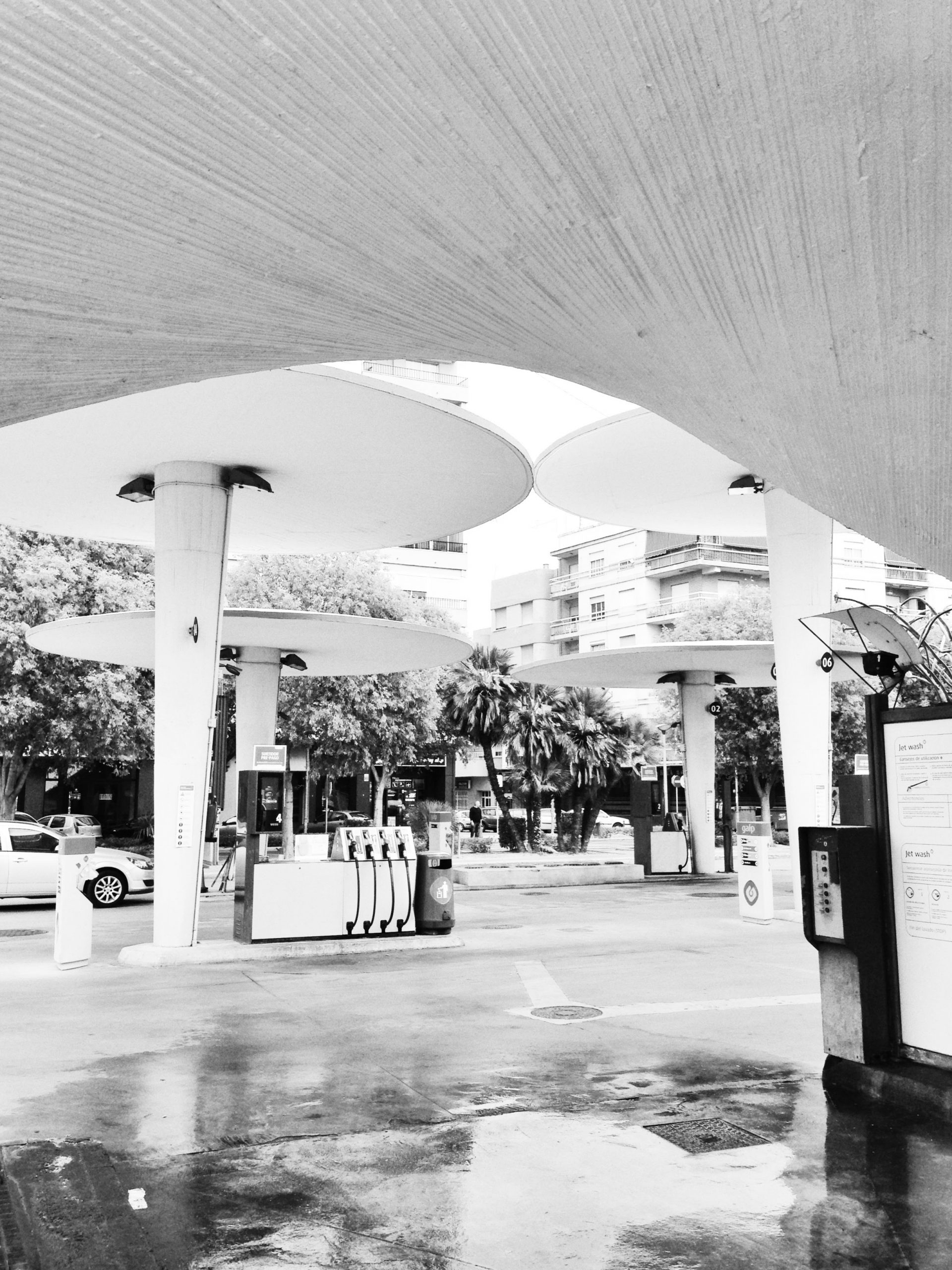 La estación de servicio se compone de tres zonas diferenciadas. Por un lado, la zona de repostaje, cubierta por cinco setas de diferentes alturas que impiden que la lluvia o el sol excesivo interfieran durante el respostaje a la vez que podemos ver el entorno entre las setas, la luz nos ilumina de una forma difusa y hasta se puedan generar pequeñas corrientes de aire que hagan la experiencia más agradable. La siguiente zona es la del restaurante, en esta ocasión la forma elegida es el paraboloide hiperbólico. Se combinan 6 de ellos para cubrir un espacio en forma de triángulo picudo. Bajo él hay espacio exterior cubierto y espacio interior. El espacio interior está cerrado mediante una fachada de muro cortina. Las zonas de espacio exterior cubierto se aprovechan para lavadero. Finalmente, más apartado de la propia estación y pegado a la carretera, el edificio para venta de vehículos. Aquí la protagonista es la estructura ligera y un muro cortina con paneles opacos y transparentes. En la actualidad este edificio se encuentra mediodesmantelado y sólo queda en pie la estructura metálica. Es digna de mención sus formas redondeadas que dialogaban directamente con la sinuosidad de la estación de servicio propiamente dicha. Para un mayor hincapié en la estructura y construcción de este edificio os recomiendo la lectura de la referencia bibliográfica número 3.