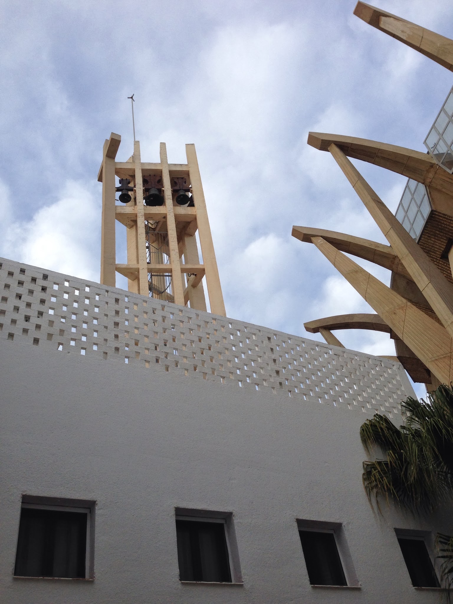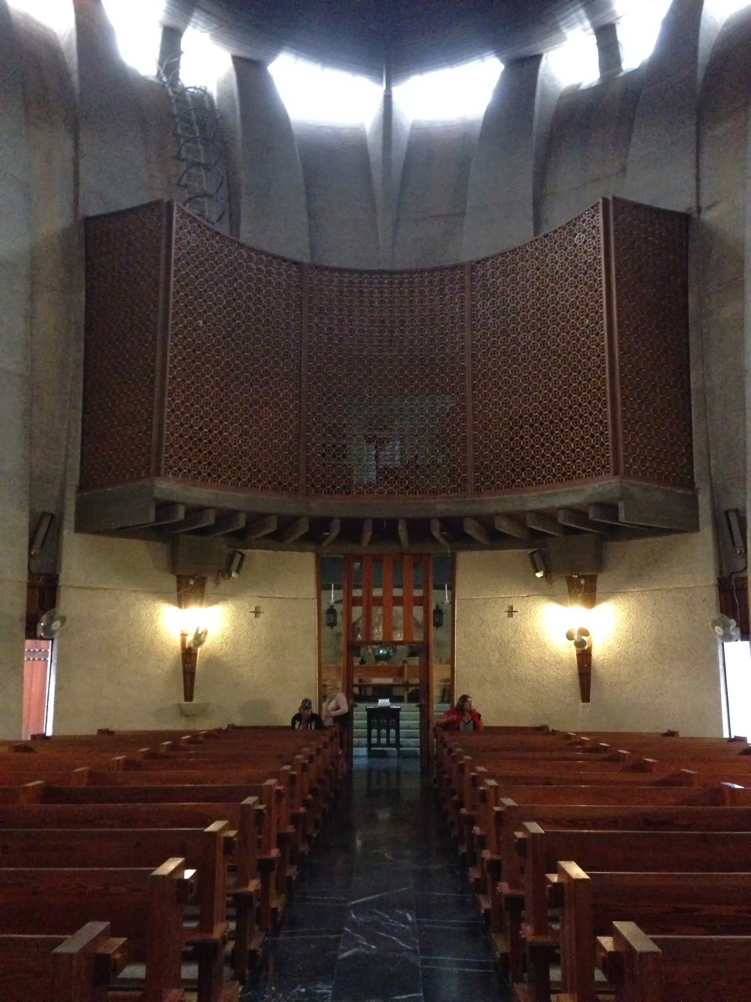 El altar sobreelevado coronado por un Cristo flotante colgado directamente de la estructura y gracias a la caída de la luz sobre él añade mayor misterio. El conjunto de la iglesia se completa con varios anexos como la escuela parroquial y servicios que se relacionan con la nave principal mediante patios. El lenguaje en estos edificios es más sencillo aunque siguen la línea del edificio principal mediante el uso del hormigón visto como elemento unificador del conjunto.