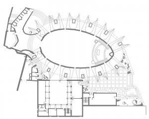Se establecen tres circulaciones, dos laterales que son tangentes a las fachadas curvadas de la parroquia, y una central que sigue el eje de la quilla ubicada en la cubierta.