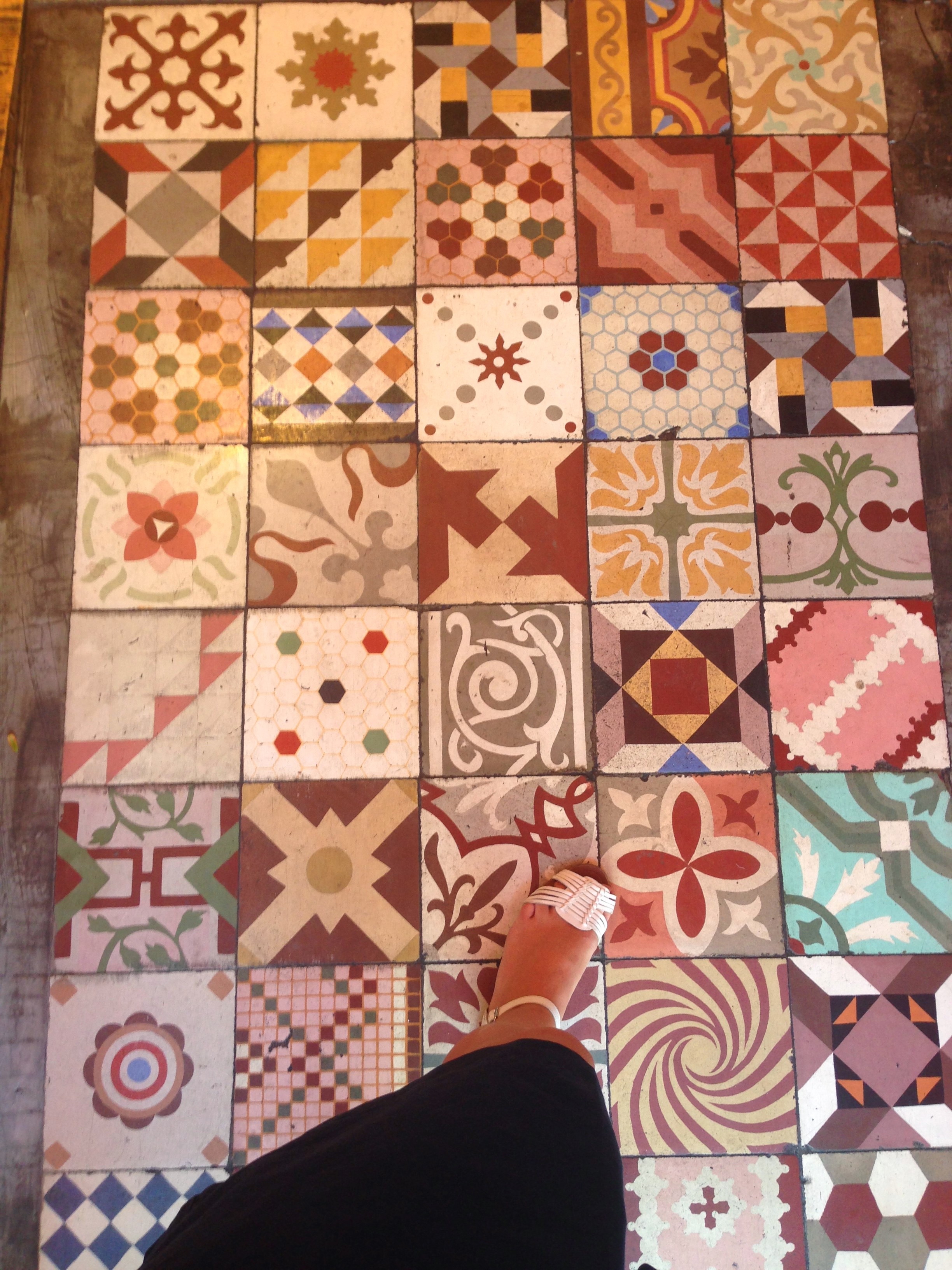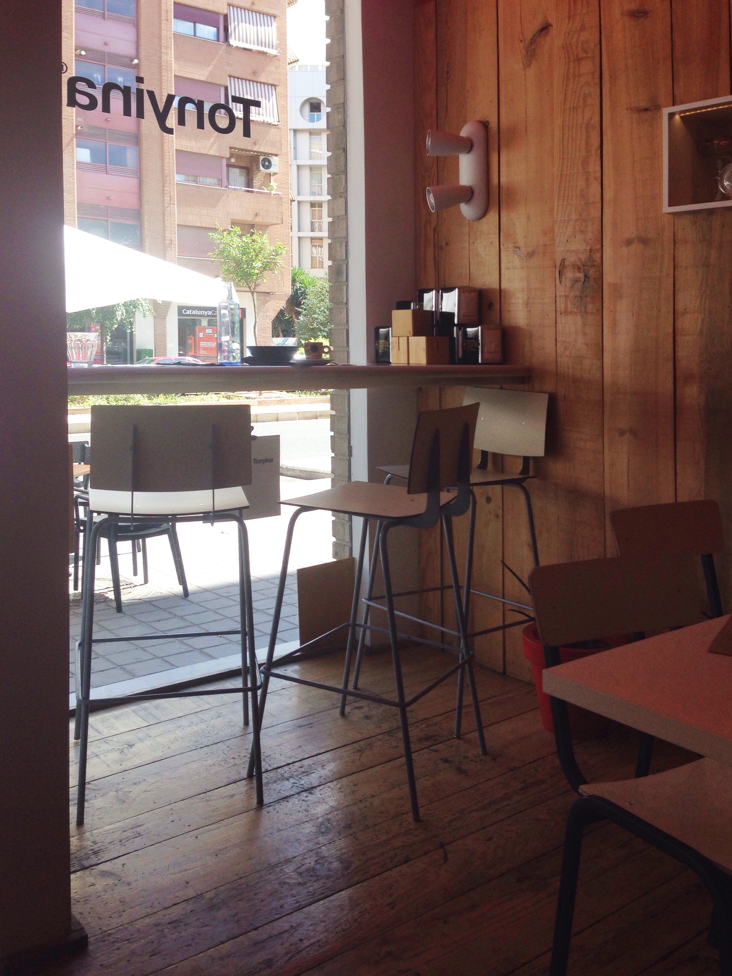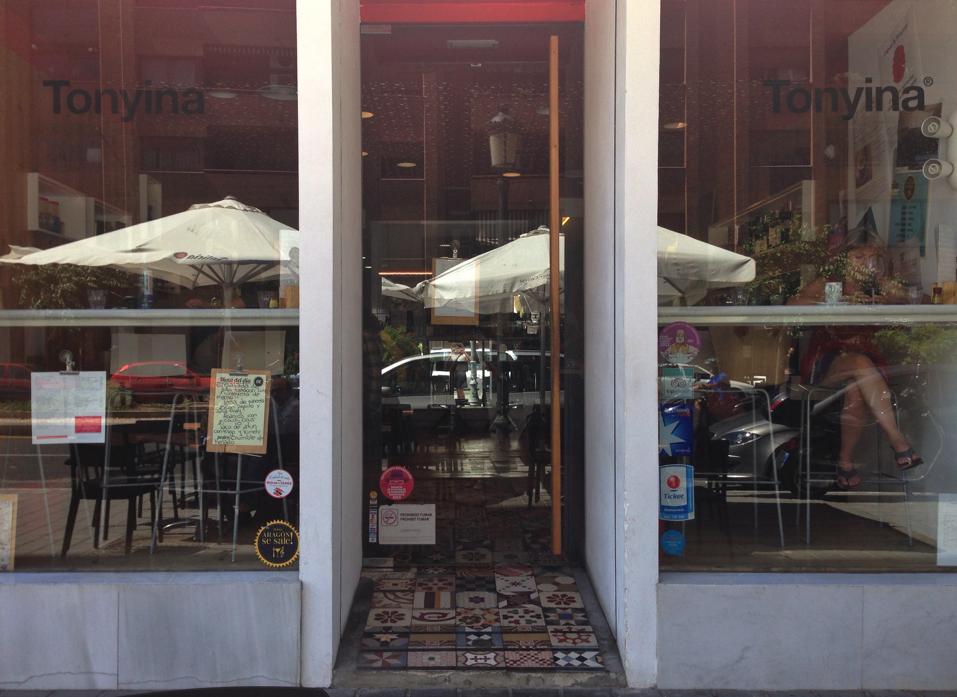 Uno de los puntos fuertes que tiene el interiorismo del Bar Tonyina, bajo de mi punto de vista, es que ha sabido abarcar los diferentes tipos de personas que pueden disfrutar comiendo en él. La rampa de acceso está pavimentada con baldosa hidráulica de colores vivos que se han dispuesto de forma arbitraria dando un toque de color a la, en general, paleta de colores sobria del resto del local. El acceso está franqueado por dos barras lineales que dan vistas a la calle para cuando vayas solo o con una persona pero no podáis entreteneros mucho en la comida. Están sobre elevados desde el nivel de la calle y el ritmo que se observa por las ventanas-escaparate es otra diversión más a sumar a la comida.