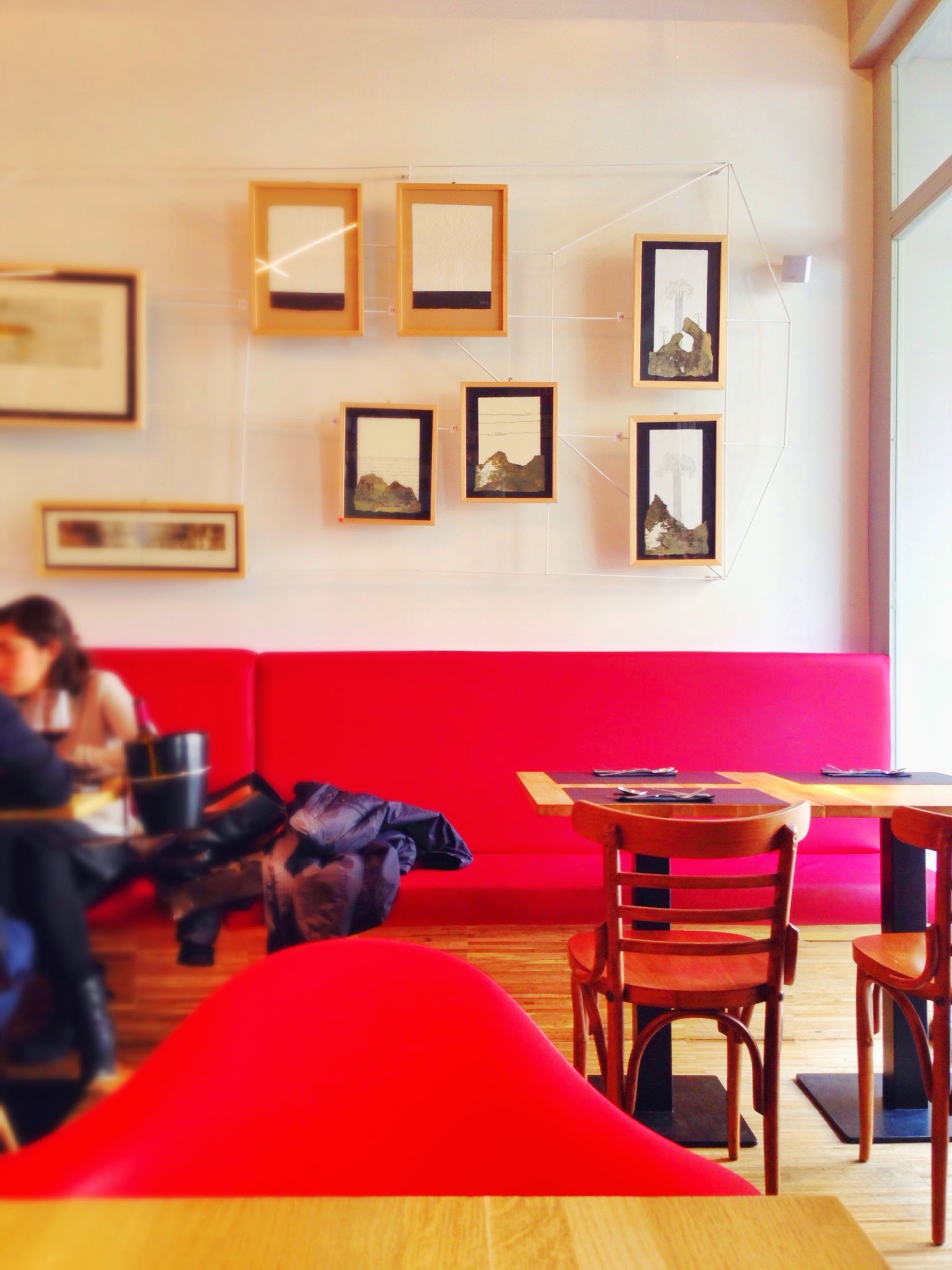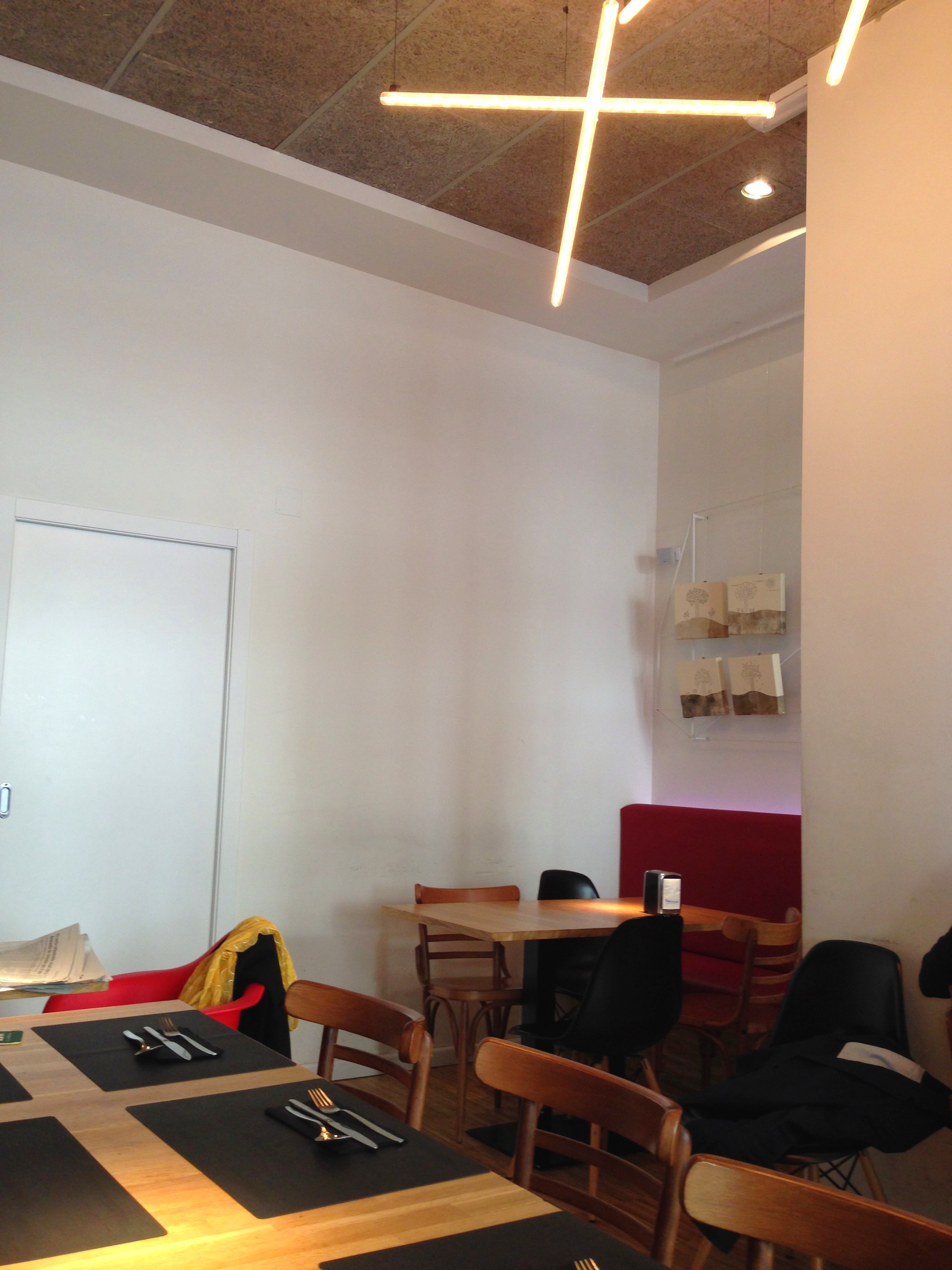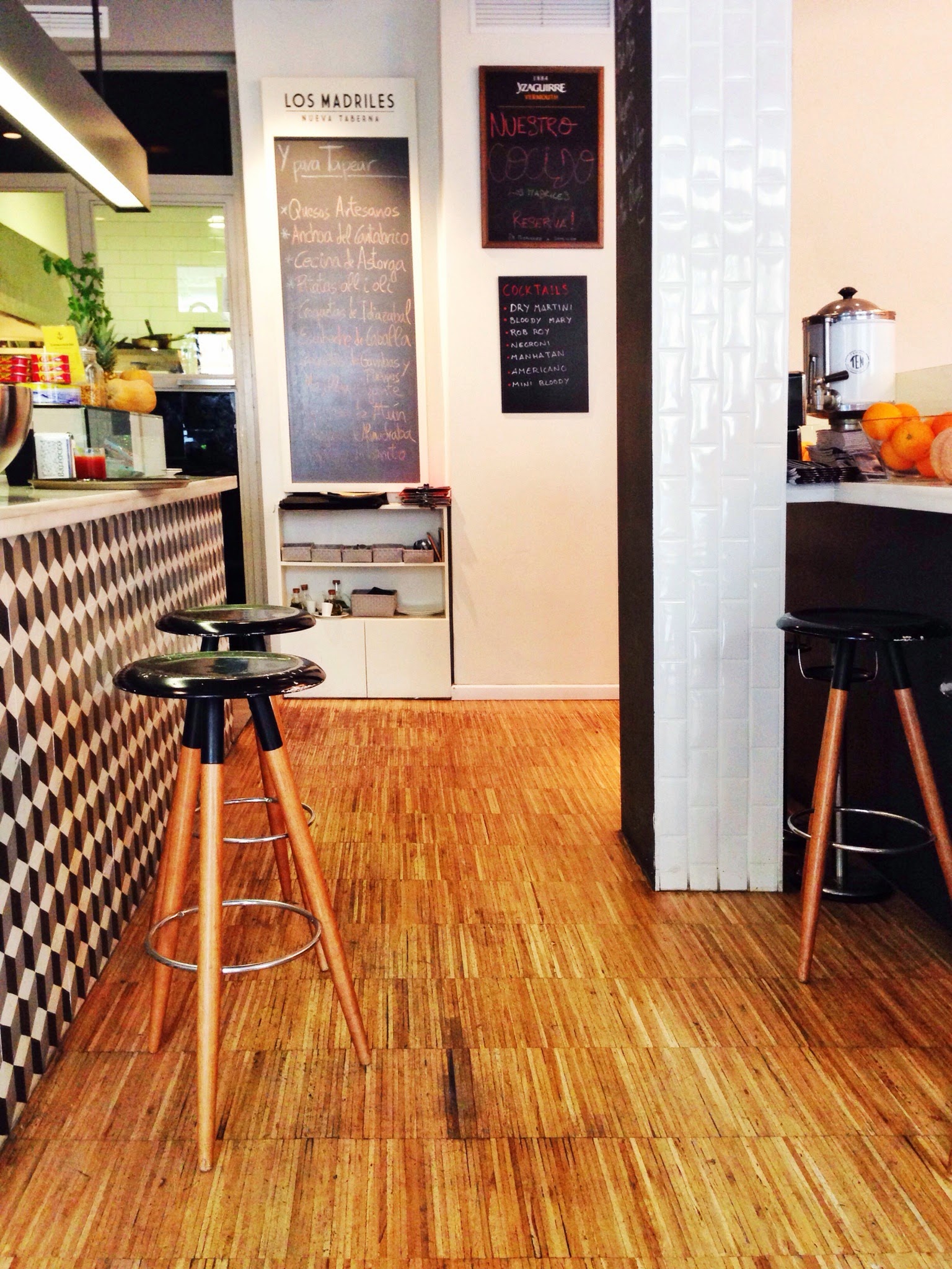 Para el diseño del interiorismo se ha tenido en cuenta la historia que tiene detrás. No sólo se ha conservado el nombre; antes mismo de traspasar la puerta de acceso, revistiendo el pilar que forma parte de la fachada se ha reutilizado parte del alicatado que había tras la barra antes de la remodelación. Clara declaración de intenciones, aquí se retoma la tradición en la forma de hacer las cosas y el buen producto para adoptarlo a un presente atemporal. Un proyecto integral que engloba el interiorismo, página web, cartas, tarjetas de visita, cartelería y señalética. Un ejemplo del proyecto global es la utilización del diseño de la baldosa hidráulica que reviste el frente de la barra y los suelos de los baños es el motivo también del fondo de la web y las tarjetas de presentación. Nada se ha olvidado en este renacer de un local «de tota la vida». El espacio está dividido en las diferentes formas en las que puedes disfrutar de la carta; en la fachada hay barras corridas de madera maciza donde poder disfrutar del sol y el vermouth los domingos de invierno y las tapas especiales que haya ese día. En la zona de la barra donde queda expuesta la bodega de la taberna sobre unas ligeras estanterías metálicas y podemos perdernos eligiendo con qué vino acompañar la deliciosa croqueta que abre el apetito para el cocido. Ya, en la zona de mesas el mobiliario se combina entre asientos corridos, sillas de la abuela y los sillones de los Eames en colores vivos. El arte expuesto se estructura sobre una red de finos perfiles metálicos que en sí mismos ya forman una escultura sobre el paramento.  Azulejos de metro, baldosa hidráulica, parqué de bambú, pintura de pizarra, falso techo acústico, madera maciza para las superficies horizontales y sillas de diseño.