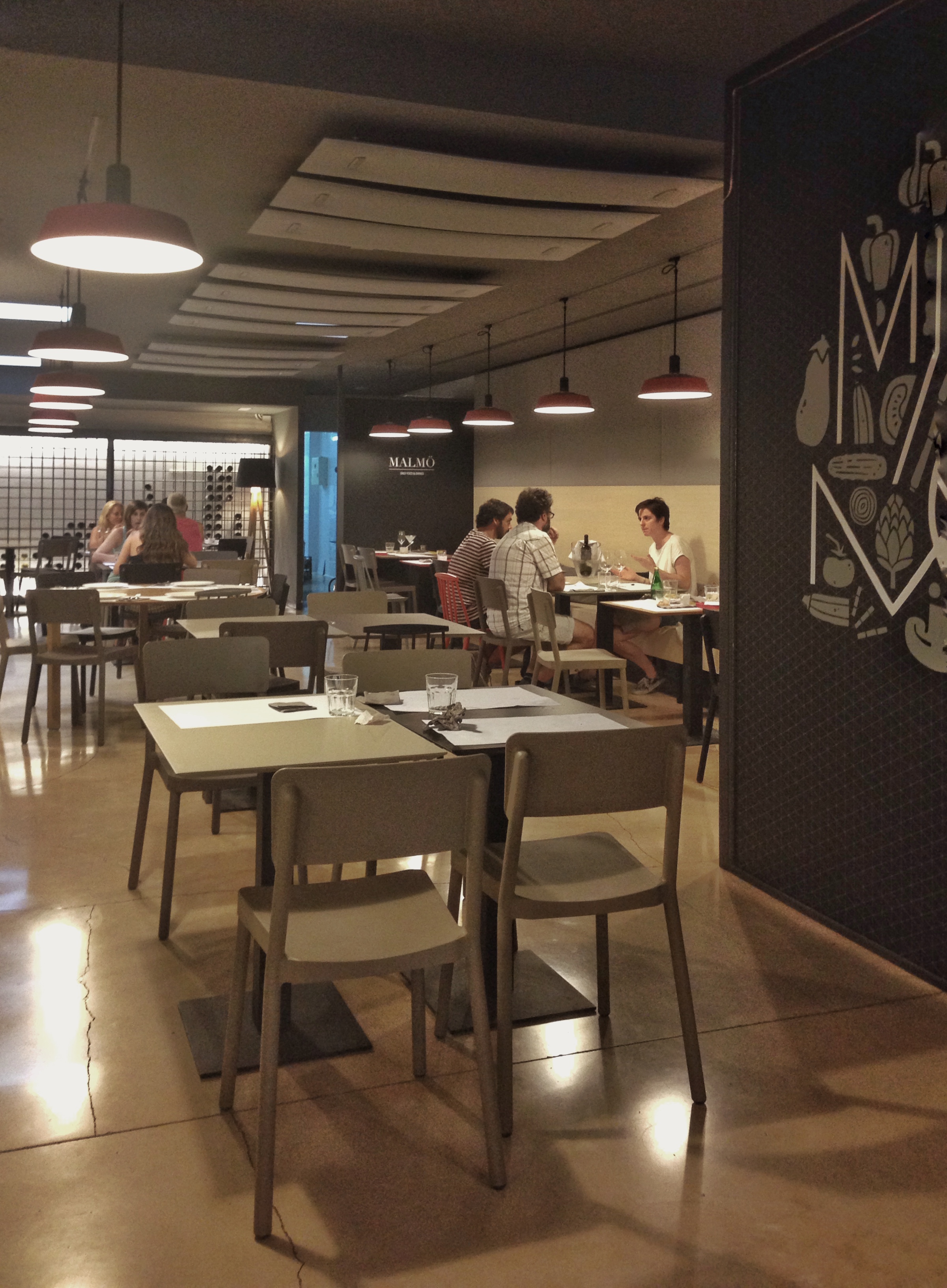 En el caso de Malmö, la preexistencia del local era ya un restaurante por lo que la distribución espacial ya venía determinada. El acceso se produce por la calle Sueca que en este punto tiene una acera bastante estrecha así que la primera zona del local sirve como terraza cubierta y, de forma ingeniosa, como almacén del restaurante. Traspasada la carpinteria metálica pintada en negro se encuentra la primera zona de barra apoyada en la pared que es la continuación de la barra de servir y recepción propiamente dicha. Es un espacio amplio y bien iluminado por lo que hace que la espera resulte agradable y pueda acompañarse de alguna bebida de las expuestas tras la bodega de la barra. El carril sobre el que va montada la iluminación de la barra nos marca la dirección de camino al salón principal del restaurante. Al final del carril y la barra se genera otra pequeña zona de espera previa al salón delimitada por el mural con el nombre del restaurante realizado por el artista Lawerta. El salón se distribuye por grupos de mesas de una forma versatil según el número de comensales de cada servicio. El final queda rematado por otra bodega en forma de jaula que se ilumina cenitalmente y el acceso oculto a los aseos y cocina.